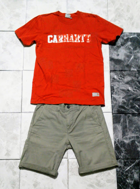 赤いTシャツはCARHARTT(カーハート)とフラグメントのコラボの物です。赤いTシャツ×ベージュのショーツって組み合わせはシンプルなんで受けも良いかと思っています。